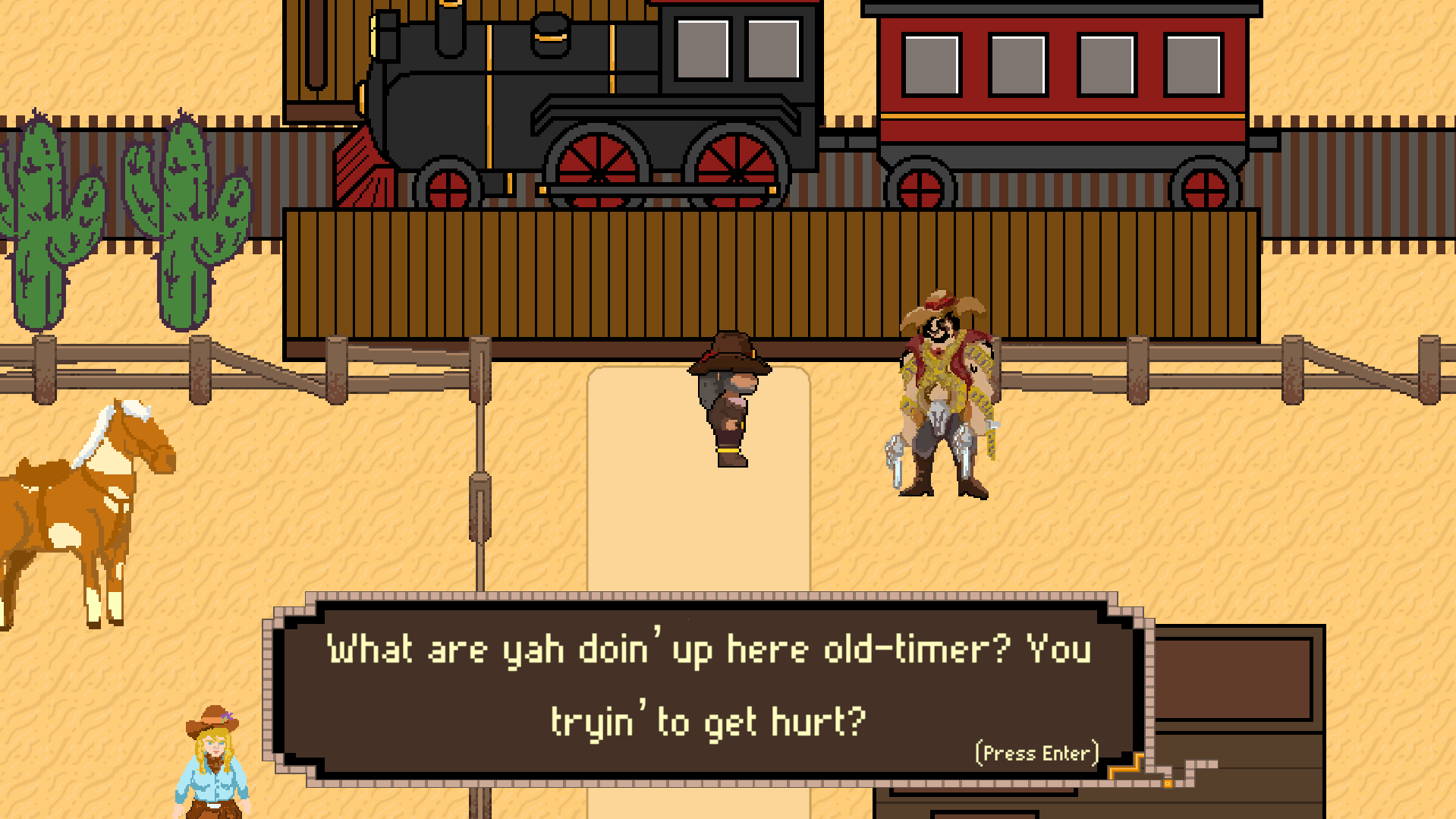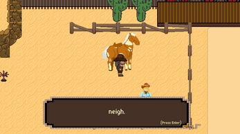 Play as Bullseye Bill as he explores the Wild West! Learn the ropes from the local sheriff and test your skills against the deputy Cactus! Choose from the available preset decks and weapons to practice and eventually challenge the ruthless train bandit! Enjoy interacting with denizens of the wild west, battling in fast paced card duels, and trying out different combinations of weapons and decks!