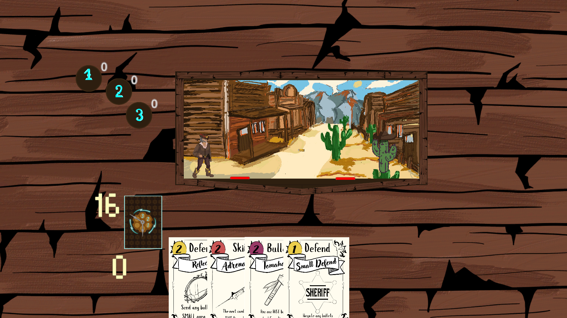 Three Two One Draw is a deck building RPG that combines the slow, methodical choices of building a perfect deck, with a fast-paced combat system that simulates a western style duel. With your chosen weapon and a deck full of defenses and skills, you enter a turn less gunfight that tests real time reaction speed and deck cohesion! In the game, you play as the time traveling cowboy, Bullseye Bill as he travels between time periods helping citizens and defeating infamous villains from across time and space.